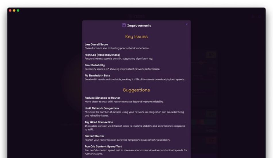 Si le score d'Orb tombe en dessous de la plage optimale, l'application utilise des grands modèles linguistiques (LLM) pour fournir des explications claires des problèmes potentiels et suggérer des solutions pratiques. Cette approche proactive permet aux utilisateurs de résoudre efficacement les problèmes de connexion.